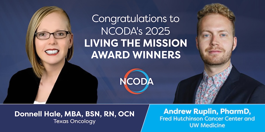 The NCODA Living the Mission Award recognizes members who exemplify the Mission and values of NCODA. Our Mission is to empower the medically-integrated oncology team to deliver positive, patient-centered outcomes by providing leadership, expertise, quality standards and best practices.