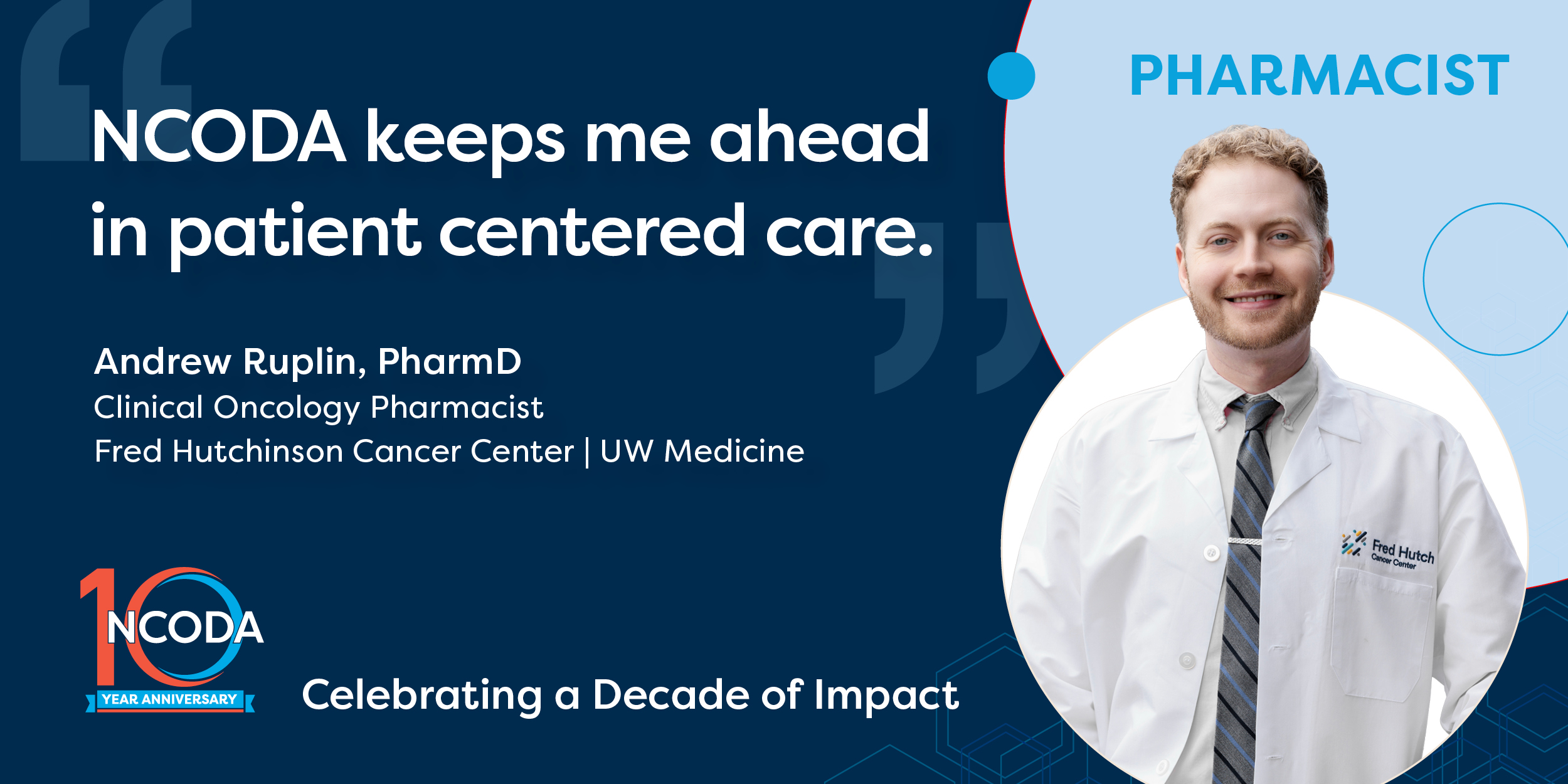 As part of NCODA’s 10-year anniversary celebration, we are proud to highlight members whose dedication has shaped our mission and advanced patient-centered oncology care. In this member spotlight, we introduce Andrew Ruplin, PharmD, of Fred Hutchinson Cancer Center and UW Medicine. His story exemplifies the passion, innovation, and commitment that NCODA members bring to their patients and the oncology community every day.