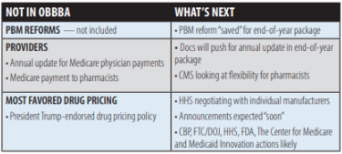 PBM REFORM: White said one item that is almost unanimously supported is a bipartisan agreement on Pharmacy Benefit Managers (PBMs). PBM reform was included in the Housepassed OBBBA, but didn’t make it into the final bill.