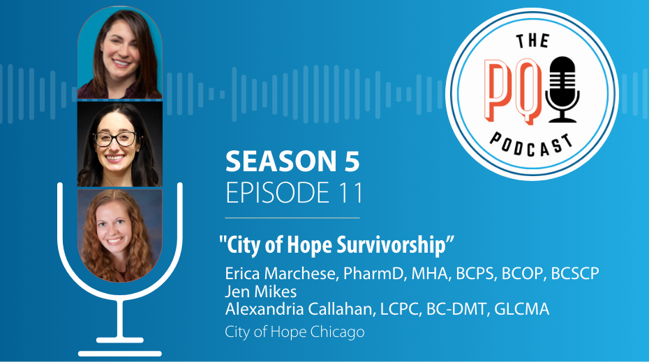 On this week’s episode of The PQI Podcast, we sit down with Erica Marchese PharmD, MHA, BCPS, BCOP, BCSCP, Alexandria Callahan, LCPC, BC-DMT, GLCMA, and Jen Mikes from the City of Hope Chicago to discuss Cancer Survivorship, exploring their respective roles, the pharmacist’s vital contribution to survivorship, and the remarkable patient programs they offer.