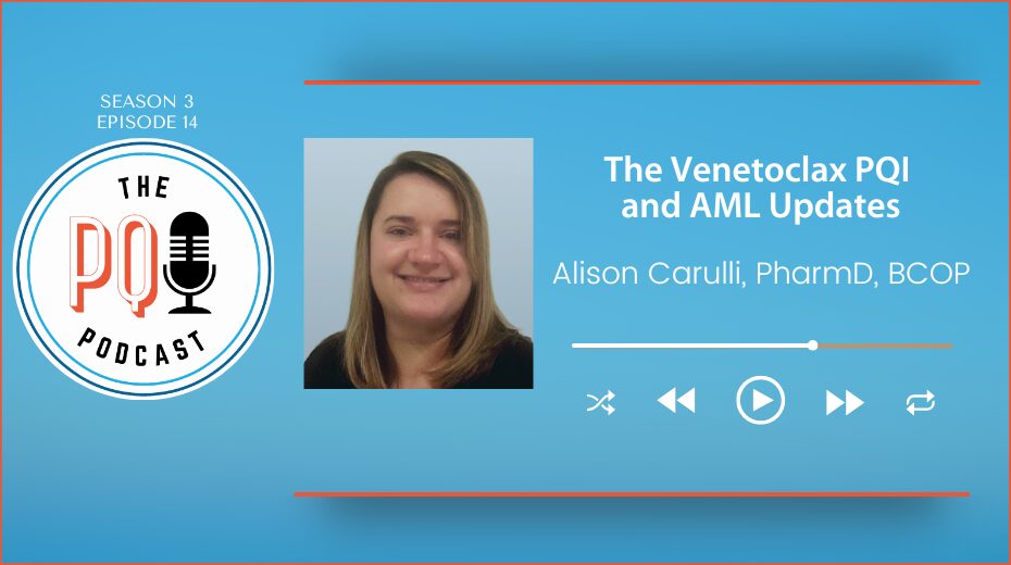 In this episode, we sit down with Alison Carulli, PharmD, BCOP, to discuss her role as an oncology pharmacist, the venetoclax in AML PQI and AML Updates from ASH.