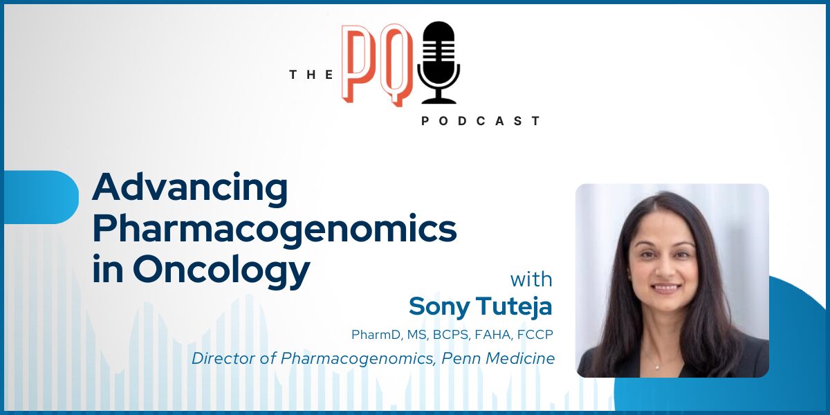In this episode of the PQI Podcast, Dr. Sony Tuteja, Director of Pharmacogenomics at Penn Medicine, shares how her team put pharmacogenomic testing into practice — and the impact it’s had on patients. She highlights findings from her Journal of Clinical Oncology article on DPYD and UGT1A1 testing in GI cancers, showing how pre-treatment testing helped reduce toxicities, guide dose adjustments, and support safer therapy.