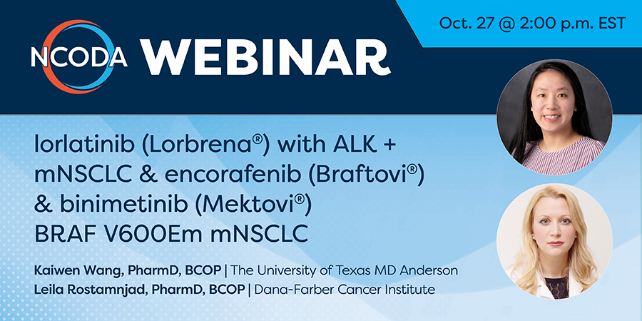Leila Rostamnjad, PharmD, BCOP (Dana-Farber Cancer Institute) will highlight new findings from the PHAROS study on encorafenib + binimetinib in BRAF V600E–mutant mNSCLC, discuss AE mitigation and patient support, and introduce NCODA’s PQI resource for optimizing supportive care and outcomes.
