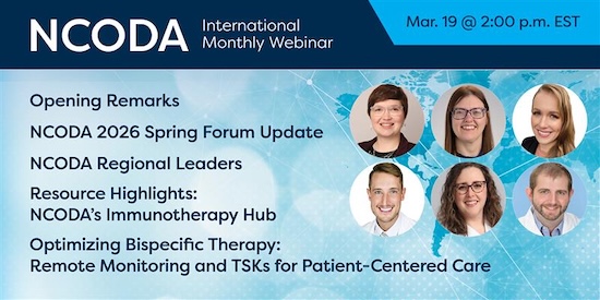 Each month, NCODA’s International Monthly Webinar highlights timely topics, shared learning, and perspectives from across oncology care. This month, we’re focused on Spring Forum, NCODA Regional Leaders, the Immunotherapy Hub, and care strategies supporting patients receiving bispecific therapy.